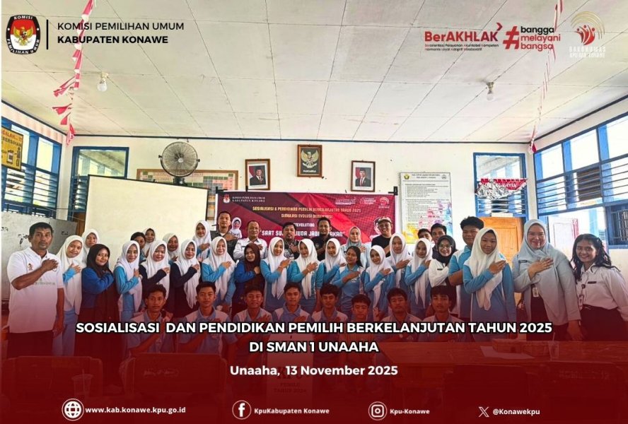 Dalam upaya menumbuhkan kesadaran berdemokrasi di kalangan generasi muda, Komisi Pemilihan Umum (KPU) Kab. Konawe bekerja sama dengan SMA Negeri 1 Unaaha menggelar kegiatan Sosialisasi dan Pendidikan Pemilih Berkleanjutan bagi Pemilih Pemula bertema “Votevolution: Saat Suara Muda Jadi Gerakan.” (Kamis, 13/11/2025) Kegiatan yang berlangsung di Ruang Pertemuan SMA Negeri 1 Unaaha ini diikuti oleh Tiga Puluh siswa SMA sebagai bagian dari program pembinaan kesadaran politik sejak dini. Berbeda dari kegiatan sosialisasi pada umumnya, acara kali ini dikemas secara interaktif dan kreatif dengan menghadirkan mini simulasi pemilihan umum bertajuk “Simulasi Evolusi Demokrasi.” Para siswa tidak hanya mendengarkan penjelasan tentang arti penting demokrasi dan proses pemilu, tetapi juga langsung mempraktikkan bagaimana menjadi pemilih, saksi, dan petugas KPPS. Kegiatan dibagi ke dalam tiga fase, yang diawali dengan pemaparan singkat oleh Ketua Divisi Sosialisasi Pendidikan Pemilih, Partisipasi Masyarakat dan SDM Bapak Dr. Andi Muh. Dzul Fadli, S.Sos., M.Si. serta Ketua Divisi Teknis Penyelenggaraan Pemilu Bapak Ramdhan Riski Pratama, S.H., kemudian dilanjutkan dengan Pengenalan peran dalam pemilihan, serta Simulasi pemungutan dan penghitungan suara. Melalui konsep ini, siswa diajak memahami bahwa demokrasi yang kuat lahir dari kesadaran dan partisipasi aktif warga negara. Dalam sesi pemaparan berjudul “Pemilih Muda dan Evolusi Demokrasi di Indonesia,” Bapak Andi Muh. Dzul Fadli menegaskan bahwa lebih dari 50% pemilih pada Pemilu mendatang berasal dari kalangan muda. “Generasi muda bukan hanya masa depan bangsa, tetapi juga penentu arah demokrasi. Melalui Votevolution, kami ingin menunjukkan bahwa perubahan besar bisa dimulai dari satu suara,” ujarnya. Para siswa antusias mengikuti jalannya simulasi. Beberapa di antara mereka bahkan menunjukkan kemampuan berargumentasi dan berpikir kritis saat menyampaikan jawaban-jawaban dari pertanyaan yang dilontarkan bapak Ramdhan Riski Pratama. Kepala Sekolah SMA Negeri 1 Unaaha Ibu Ridawati menyampaikan apresiasi atas kegiatan ini. Menurutnya, pendidikan demokrasi melalui pendekatan partisipatif dan menyenangkan seperti mini simulasi ini sangat efektif untuk membangun pemahaman siswa. “Anak-anak belajar bahwa memilih bukan sekadar mencoblos, tetapi juga memahami nilai, integritas, dan tanggung jawab di balik setiap suara” ujarnya. Sementara itu, Bapak Ramdhan Riski Pratama menambahkan bahwa kegiatan ini menjadi bagian dari gerakan nasional pendidikan pemilih untuk meningkatkan literasi politik generasi muda. “Kami ingin menanamkan semangat bahwa demokrasi akan terus berevolusi selama anak muda mau bergerak dan berpartisipasi” ujarnya. Kegiatan ditutup dengan pesan inspiratif dari Bapak Andi Muh. Dzul Fadli yang mengajak siswa untuk berpartisipasi aktif dalam pemilihan “Gunakan hak pilihmu, pahami makna demokrasi, dan jadilah bagian dari Votevolution, agar suara muda benar-benar menjadi gerakan perubahan” pungkasnya. Melalui kegiatan ini, diharapkan para siswa tidak hanya memahami proses pemilu secara teknis, tetapi juga tumbuh sebagai pemilih cerdas, kritis, dan berintegritas. Karena demokrasi yang kuat dimulai dari satu langkah kecil, yakni kesadaran untuk memilih. ....