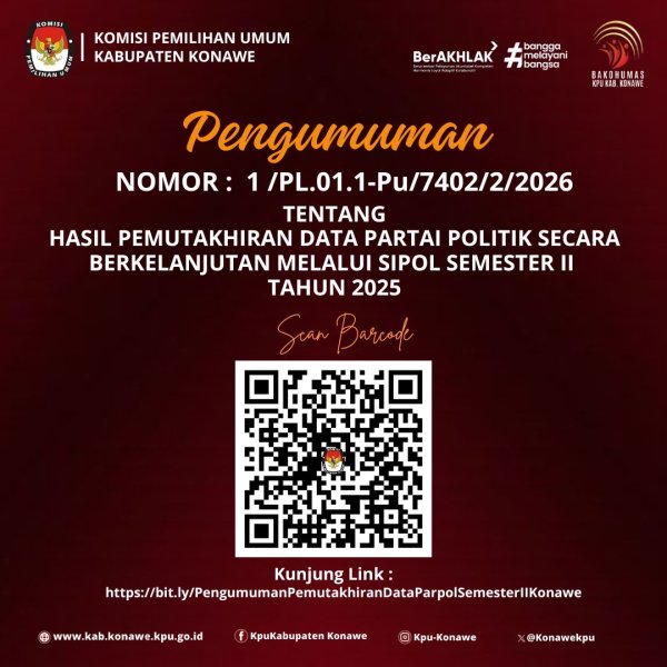 Komisi Pemilihan Umum Kabupaten Konawe mengumumkan hasil pemutakhiran data dan dokumen partai politik secara berkelanjutan melalui SIPOL Semester II Tahun 2025. Download disini ....