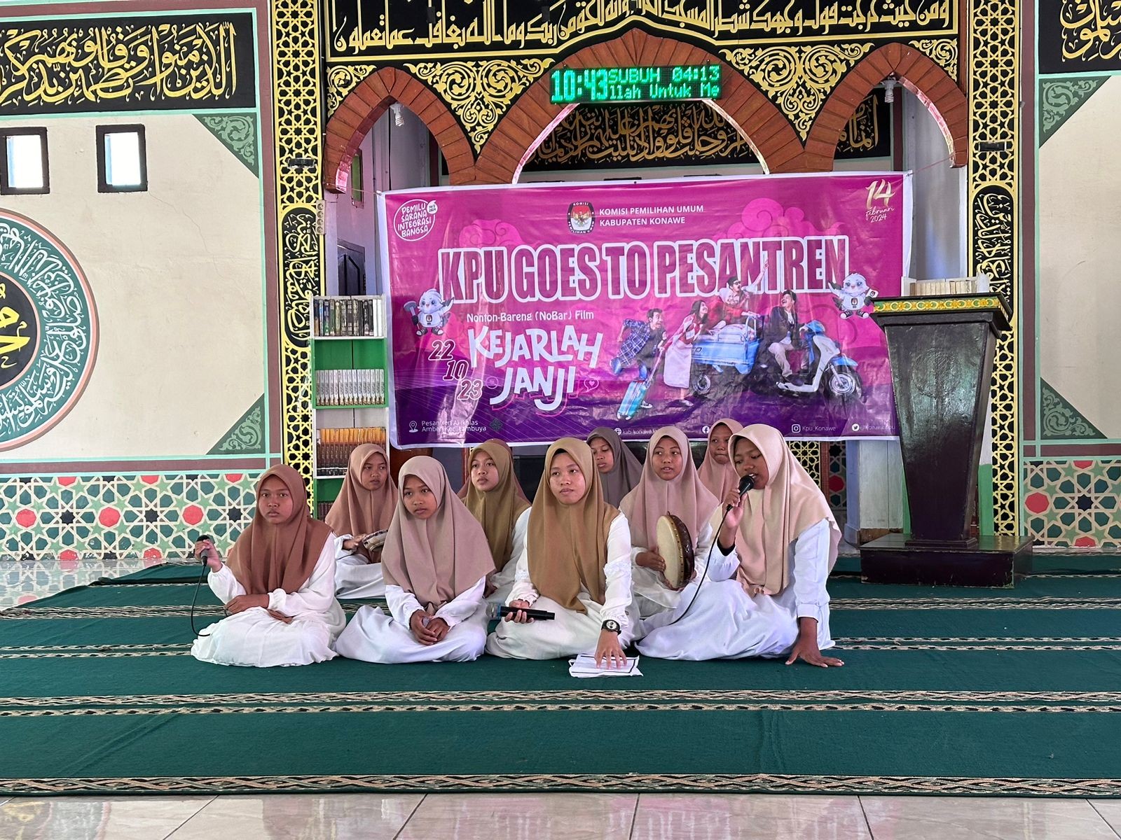 Komisi Pemilihan Umum Kabupaten Konawe menggelar nonton bareng film "Kejarlah Janji" bersama santri di Pondok Pesantren Al-Ikhlas, Desa Amberi, Kecamatan Lambuya, Minggu (22/10/2023) nonton bareng (nobar) film 'Kejarlah Janji' sebagai salah satu upaya untuk memberikan sosialisasi dan pendidikan politik kepada pemilih pemula. Kegiatan ini dilakukan dalam rangka memeriahkan Hari Santri Nasional yang dikemas dalam program 'KPU Goes to Pesantren' "Film Kejarlah Janji ini sebagai sarana sosialisasi kepada Pemilih khususnya kepada Pemilih Pemula yang ada di Pondok Pesantren Al-Ikhlas agar pemilih pemula menggunakan hak pilihnya di pemilu 2024 nanti" ujar Anggota KPU Provinsi Sulawesi Tenggara Amirudin H. Muh. Yunus Umar selaku Kepala Pondok Pesantren Al-Ikhlas mengapresiasi serta menyambut baik program nobar ini sekaligus memperingati momentum Hari Santri Nasional. "Kegiatan ini bukan hanya sekedar menonton, melainkan mensosialisasikan serta mendidik anak-anak kami, karena banyak santri pada tanggal 14 Februari 2024 mendatang ada yg sudah punya hak memilih", ujar H. Muh. Yunus Umar