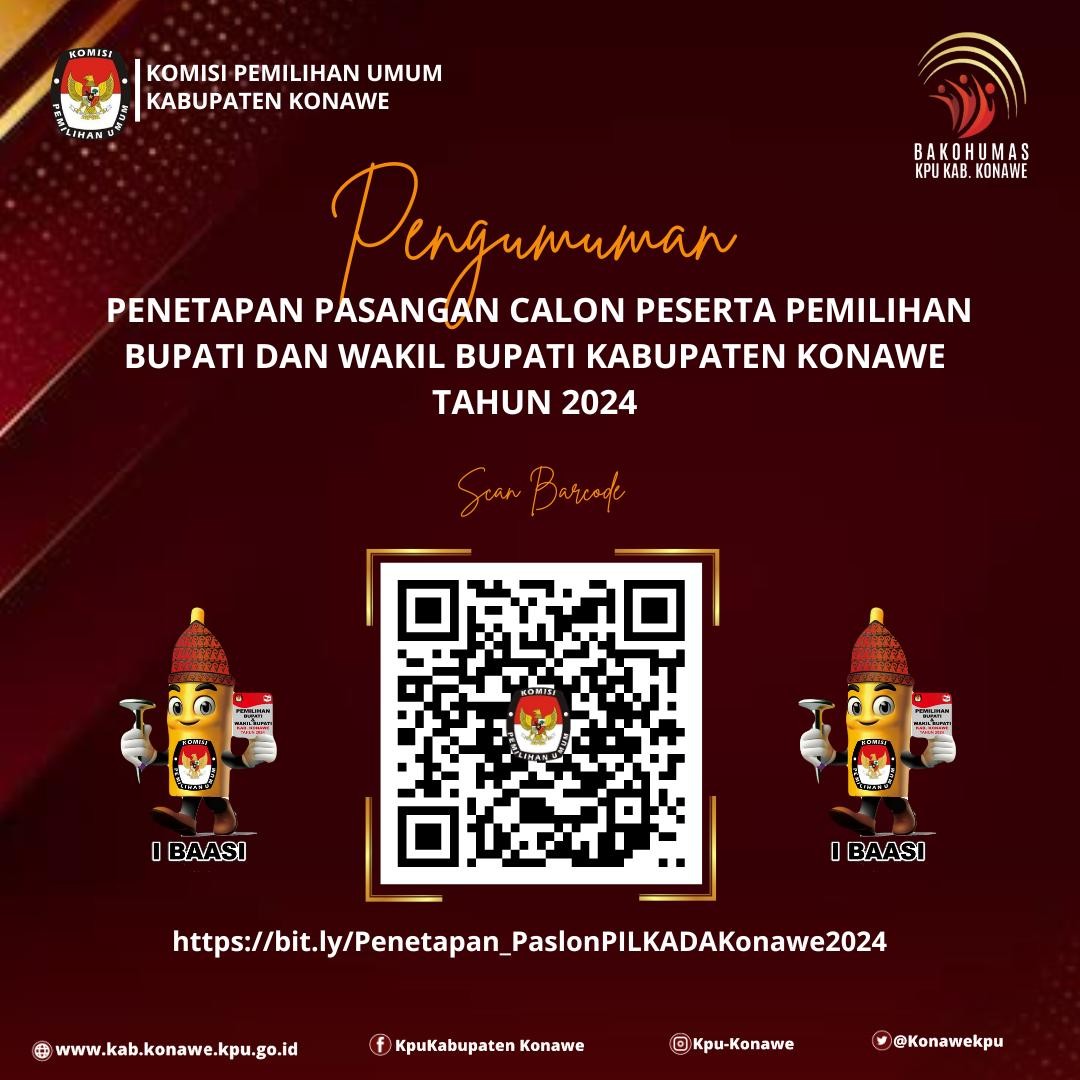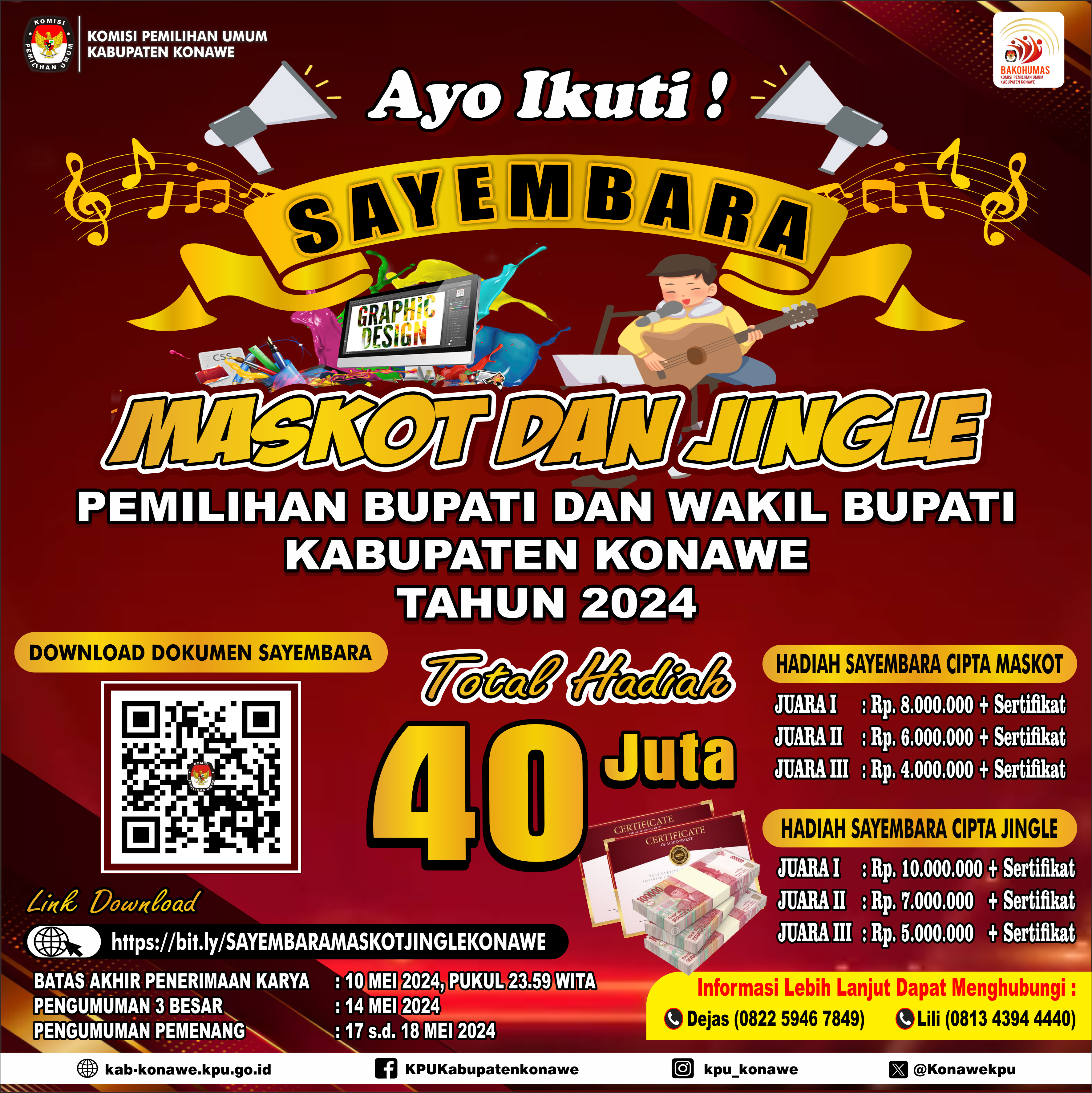 KPU Kabupaten Konawe mengadakan sayembara pembuatan maskot dan jingle Pemilihan Bupati dan Wakil Bupati Kabupaten Konawe Tahun 2024. dengan tema Cipta Maskot dan Jingle "Ide Kreatif, Berkarya Inovatif dan Tingkatkan Partisipasi Masyarakat dalam mewujudkan Penyelenggaraan Pemilihan Bupati dan Wakil Bupati Kabupaten Konawe Tahun 2024 yang Berkualitas”. Adapun syarat ketentuan maskot dan jingle Download disini
