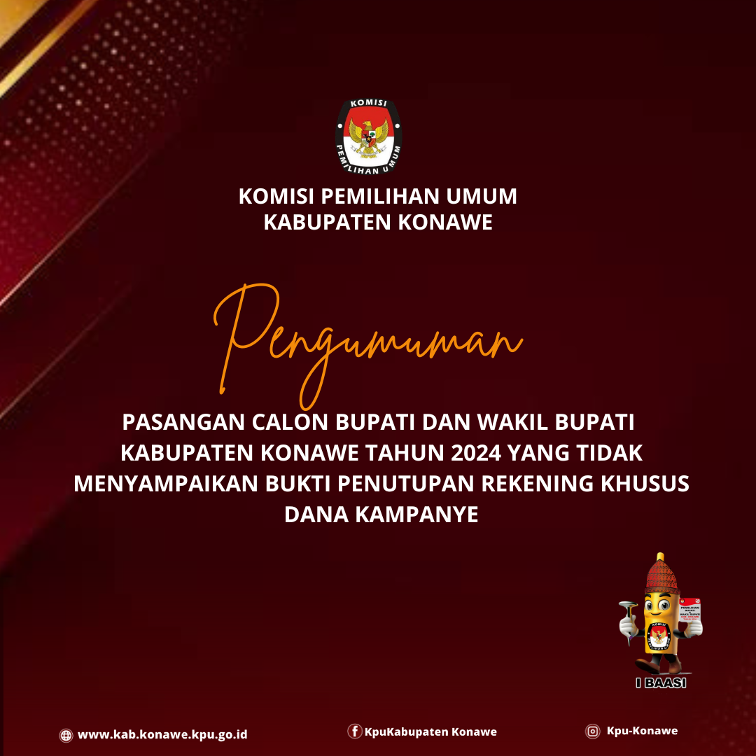 PENGUMUMAN PASANGAN CALON BUPATI DAN WAKIL BUPATI KABUPATEN KONAWE TAHUN 2024 YANG TIDAK MENYAMPAIKAN BUKTI PENUTUPAN REKENING KHUSUS DANA KAMPANYE Selasa, 26 November 2024 16:37 1390 Download Disini Bagikan: Telah dilihat 1,390 kali