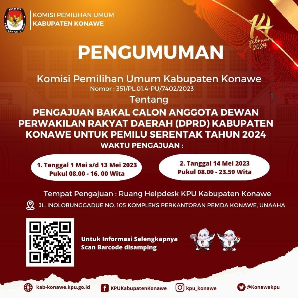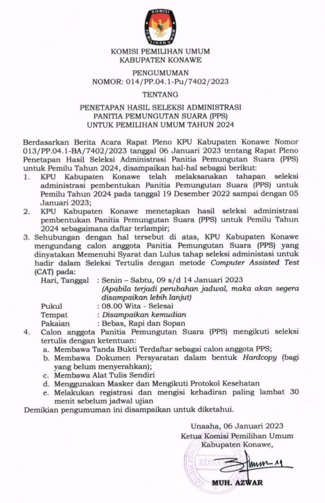 Berdasarkan Berita Acara Rapat Pleno KPU Kabupaten Konawe Nomor : 013/PP.04.1-BA/7402/2022 Tanggal 6 Januari 2023 tentang Rapat Pleno Penetapan Hasil Seleksi Administrasi Panitia Pemungutan Suara (PPS) untuk Pemilu Tahun 2024, Disampaikan hal-hal sebagai berikut: